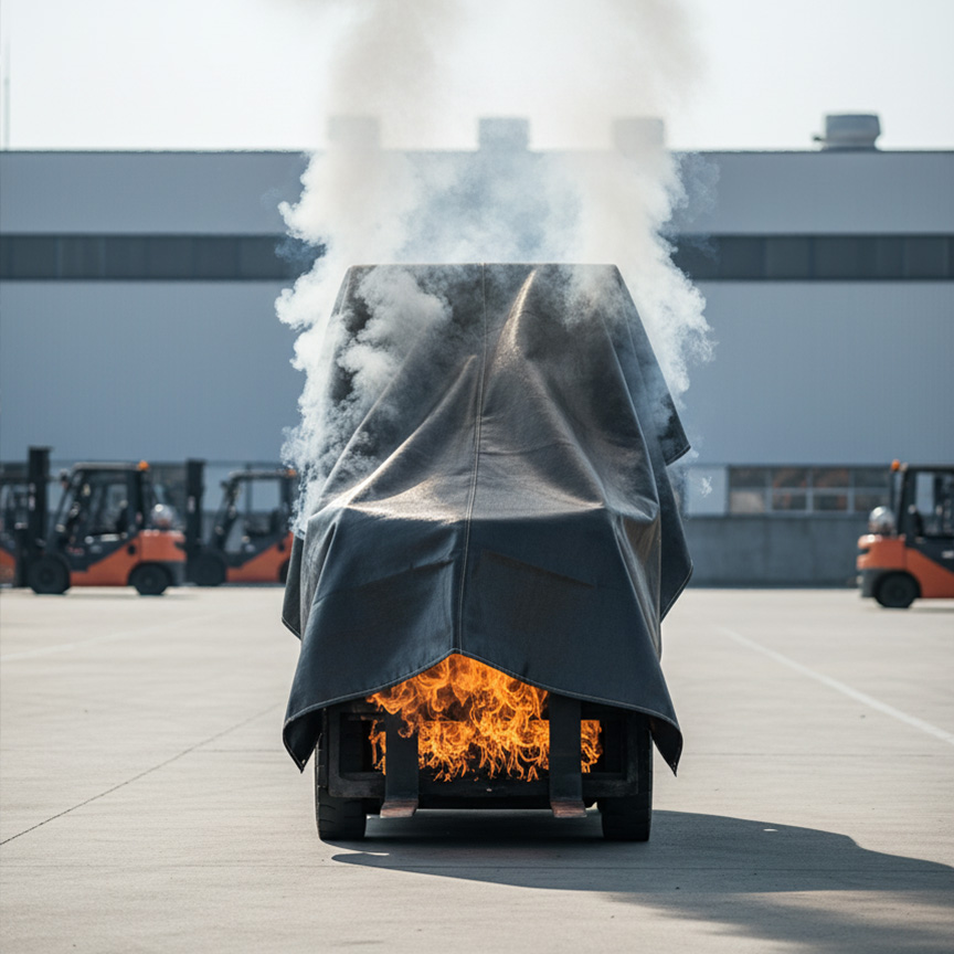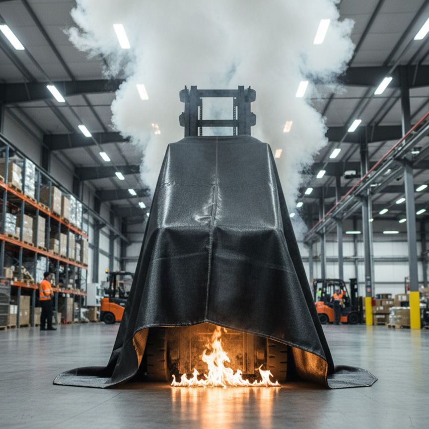 Nivofire Forklift Yangın Sınırlandırma Battaniyesi, forklift operasyonlarının gerçekleştirildiği depolar, fabrikalar ve endüstriyel bölgelerde kullanım için idealdir.