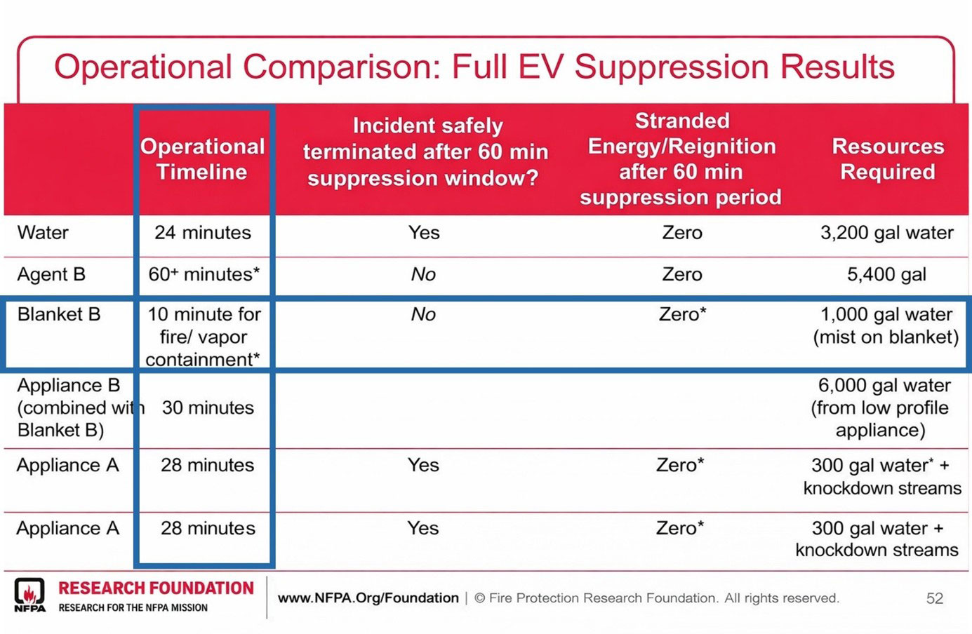 Benzer şekilde, National Fire Protection Association (NFPA) tarafından 2025 yılında gerçekleştirilen testlerde dört farklı müdahale yöntemi karşılaştırılmış ve yangın battaniyesinin batarya yangınlarını en hızlı kontrol altına alan yöntem olduğu ortaya konmuştur. Test sonuçlarına göre yangın battaniyesi kullanımı, diğer yöntemlere kıyasla yangını 2,4 kat daha hızlı kontrol altına almıştır.
