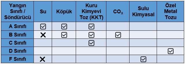 Geleneksel yangın sınıflarında kullanılan söndürücü maddeler aşağıdaki tabloda özetlenmiştir.