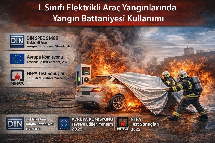 Elektrikli araç yangınları, L sınıfı yangınların en sık görüldüğü alanlardan biridir. Bu kapsamda Almanya’da Kasım 2024’te yayımlanan DIN SPEC 91489 dokümanı, elektrikli araç yangınlarında kullanılacak yangın sınırlama battaniyeleri için teknik gereklilikleri belirlemiştir.
